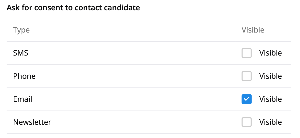 Here you can choose which contact preferences the candidate can set if they want to be contacted or not. If the candidate doesn’t give a response, this defaults to Undefined on their profile page.