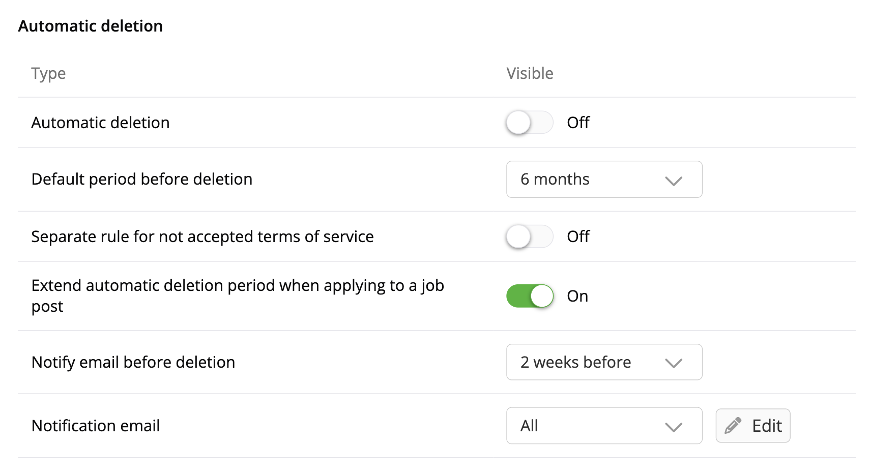 We recommend enabling automatic deletion for our users, as many candidates may apply for a job and forget their profile. This feature ensures that profiles and personal data are automatically removed if candidates forget to do it themselves, and can help you as a recruiter to keep your candidate database up to date.