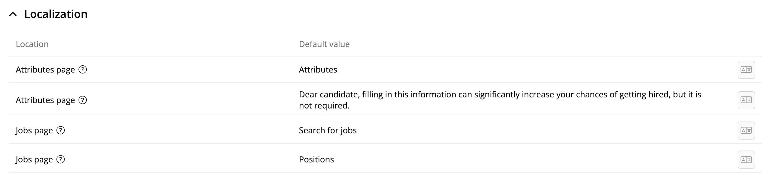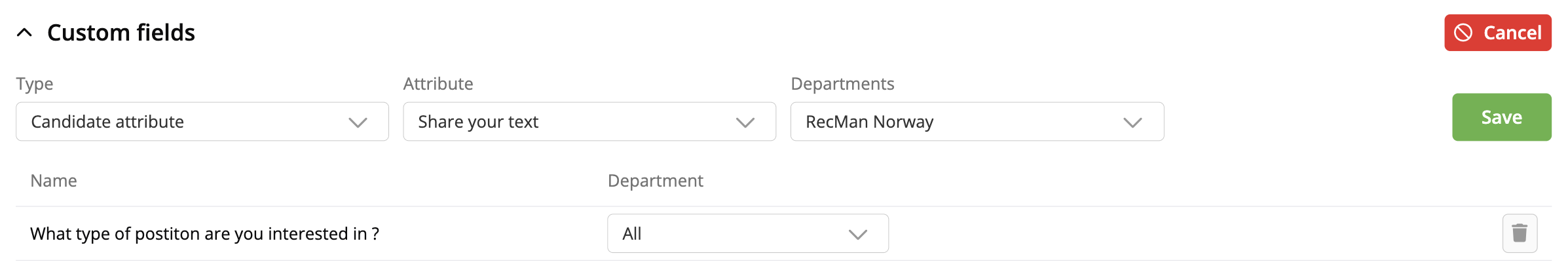 Here you can add candidate attributes that should be available for candidates to fill out on the candidate page. A nice feature if you would like to get some additional information from newly registered candidates and applicants.