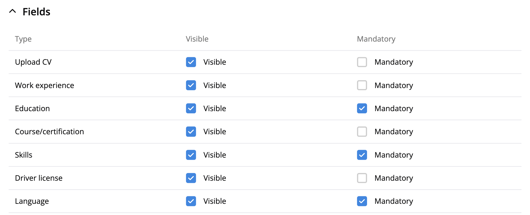 Fields are what you want the candidates to fill in on their profiles. If mandatory is activated, candidates will not be visible until the mandatory fields are populated.