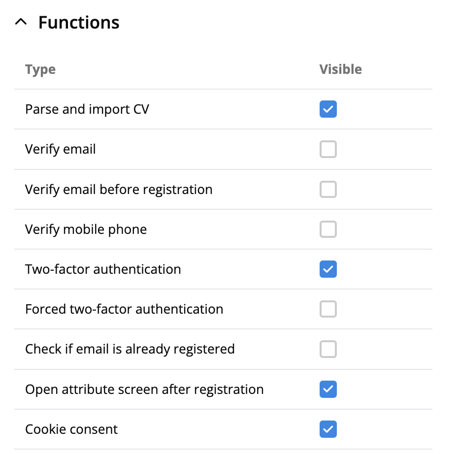 By enabling functions, you can add or remove simple functionality for the candidates on their profile page.
