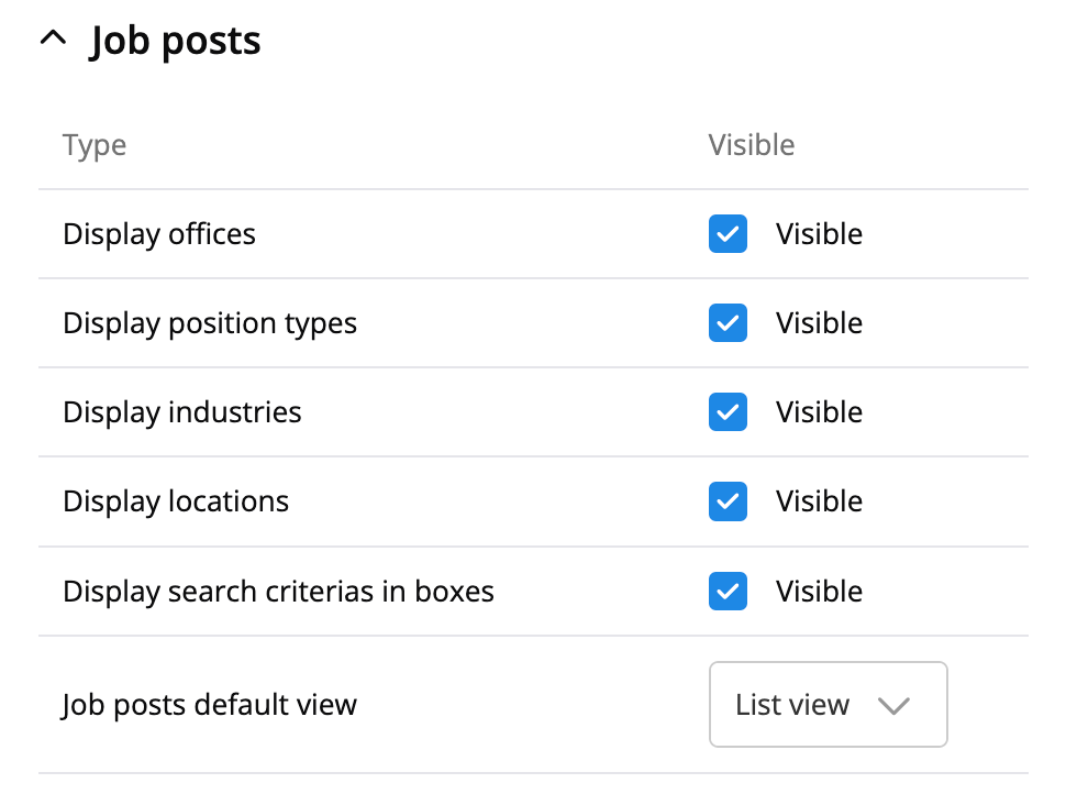 Here, you can set what filters you want to display in the job post overview for your RecMan-page. You can customize the default view (list or grid) for the Jobs page. By default, the page opens in list view, but this can easily be switched to grid view if desired. Expiry dates will display the number of remaining days, with a tooltip showing the exact expiration date for better clarity. A placeholder image will be shown for job posts without cover images, ensuring a uniform appearance. The interface will show when a job post is inactive — expired or archived — so users coming from external links (like job portals, saved links, or search results) can see its status and find other available roles.