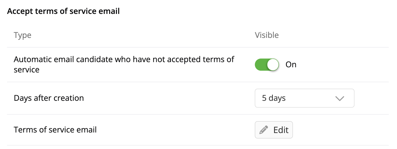 This is an email you can write that will be sent out automatically to candidates who have not yet accepted the terms of service. This feature is typically used to inform manually inputted candidates, with the tag Internal of their newly created profile, giving them the chance to log in and accept the terms of service.
