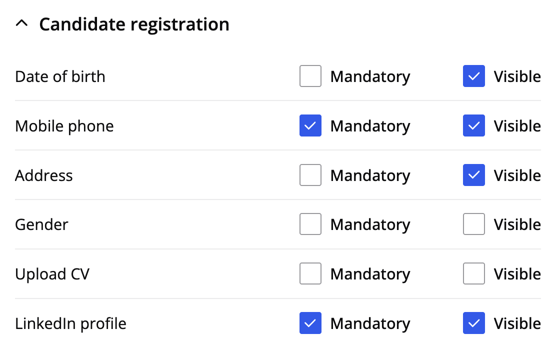 Select the fields to be mandatory and/or visible when candidates register. This can be set to make the registration process as simple as possible or to make sure you get the information that is important to you. For example, you can configure the LinkedIn profile link to be required when candidates sign up on the Career page or apply for job postings.
