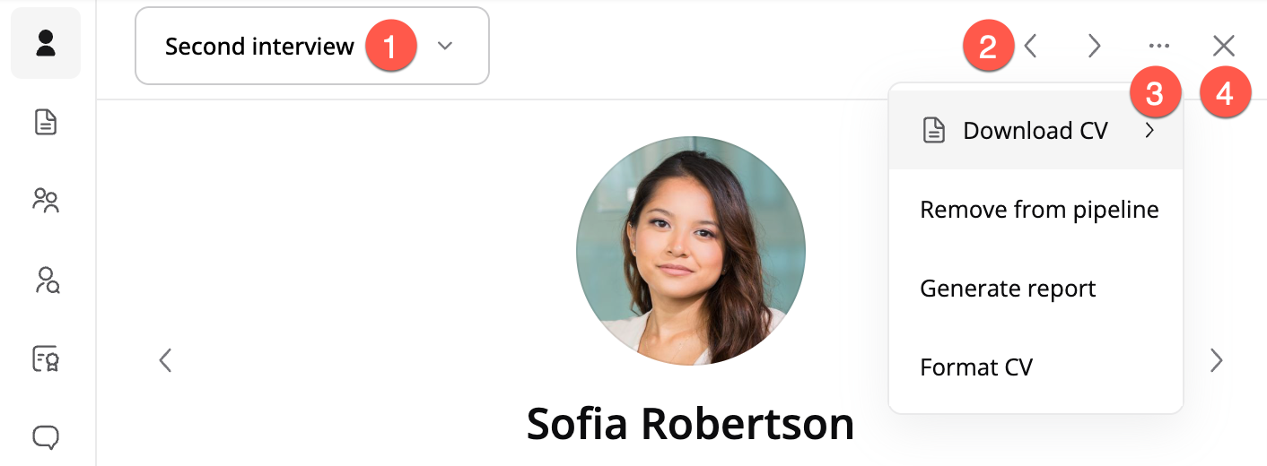 On the left-side panel, you can switch between the Applicant overview, CV, and Dialogue tabs.