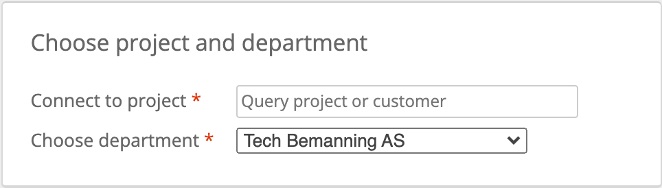 To select the project, type the name of the project in the field. Entering the customer or company information will let the system suggest which project to connect to. Afterward, you select the department. By default, the system will suggest the department you belong to, but you can also choose a different one if you would like to publish a job post on behalf of someone else. Applications for the position will be automatically associated with the chosen department.