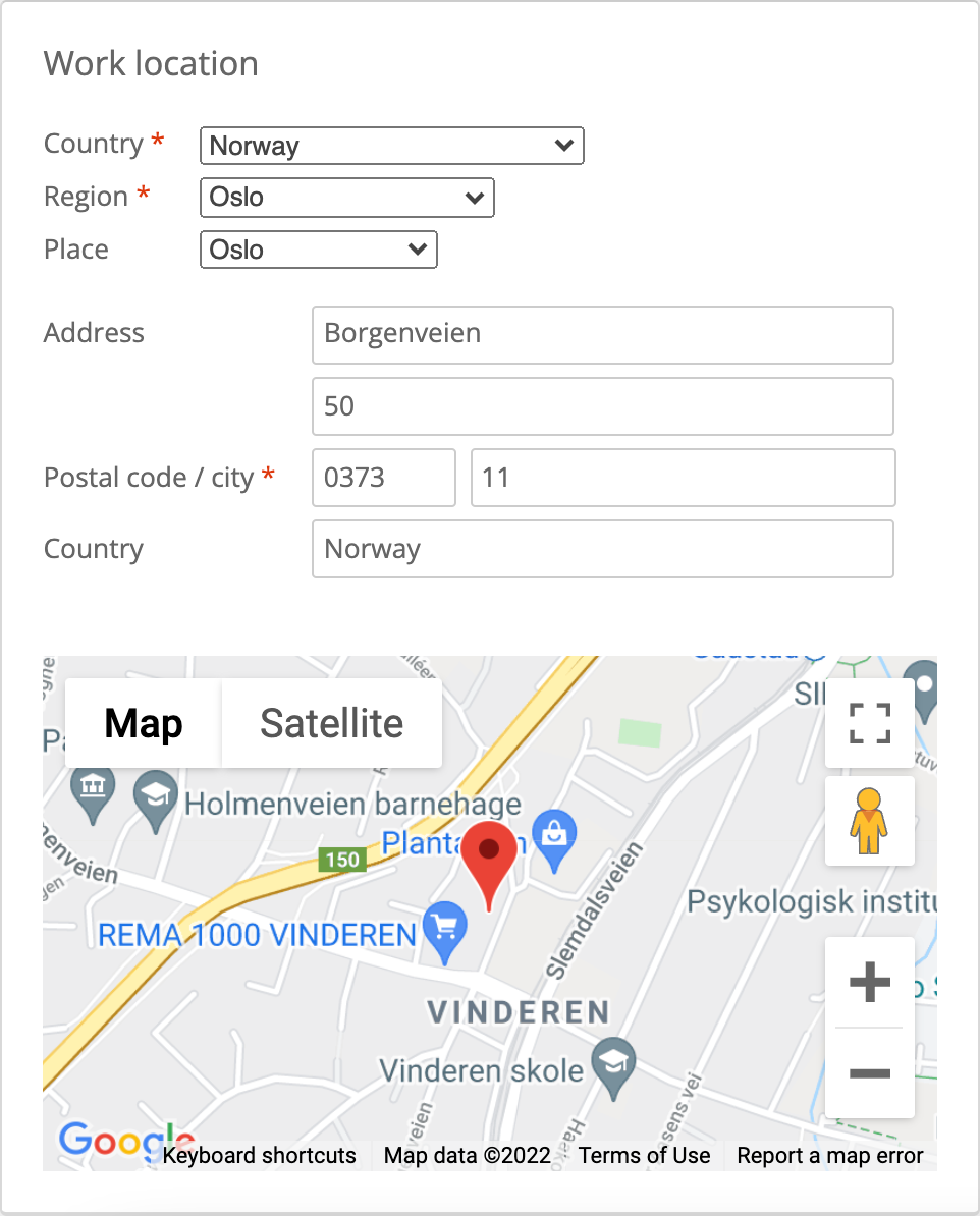 In the address field, only postcode and city are required. Check that the map is updated correctly based on the address you enter. This will also control the map on the external job posting portals.