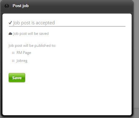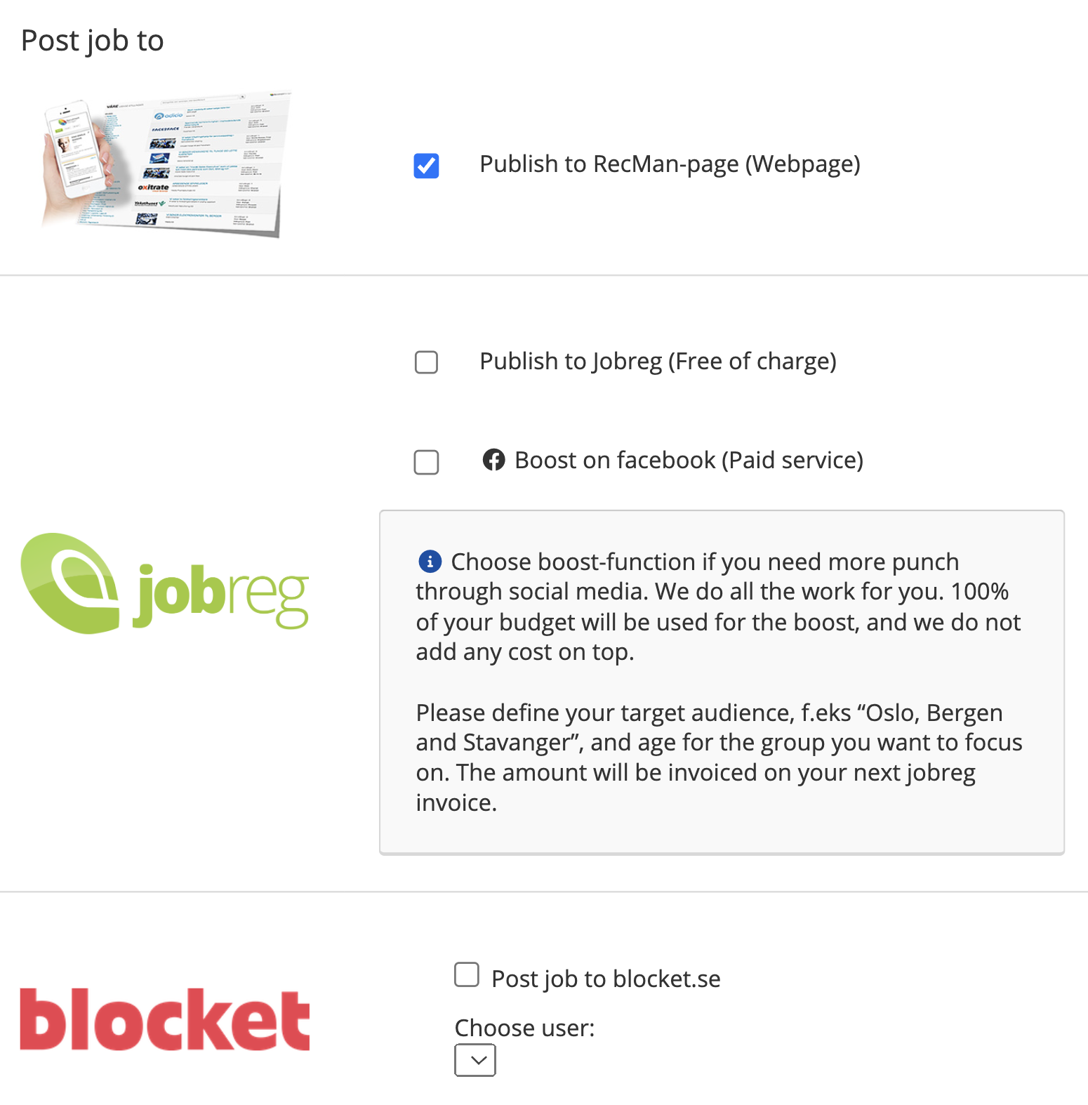 From here, you choose where you want to publish the ad itself. Progress is very simple: Check the places you want your ad to run. The top (RecMan page) is what goes out on your own website and Facebook page. Jobreg is an industry portal and, until further notice, free, so it is always checked.