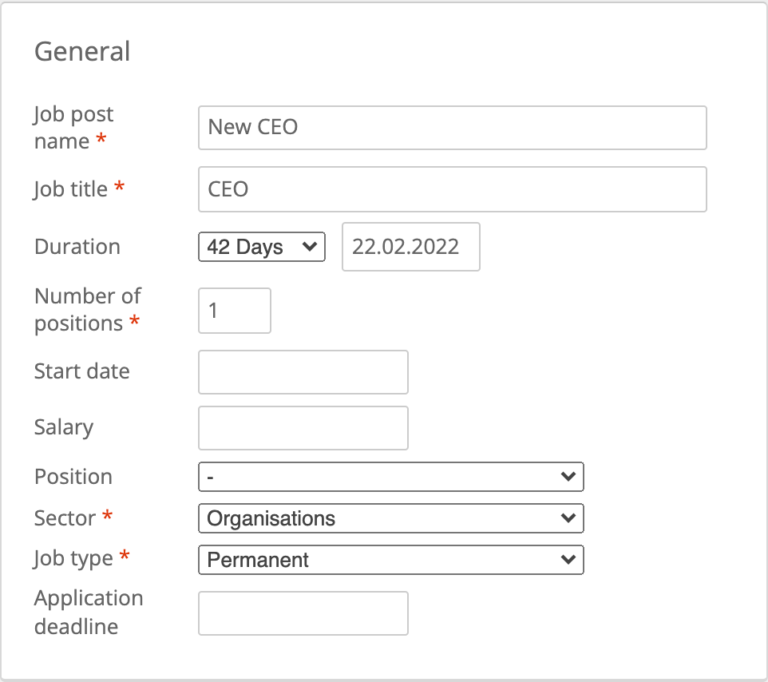 - Job post name and Job title: The job post name can include the job title but can also be an appeal to the applicant's field of interest.