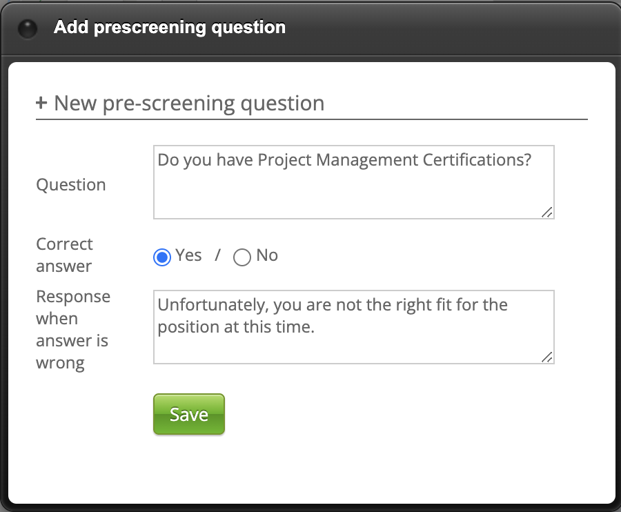 You submit one or more Yes / No questions, and how you define whether it is yes or no is the right answer. You can also post your feedback to the applicant should he select the opposite of what is required.