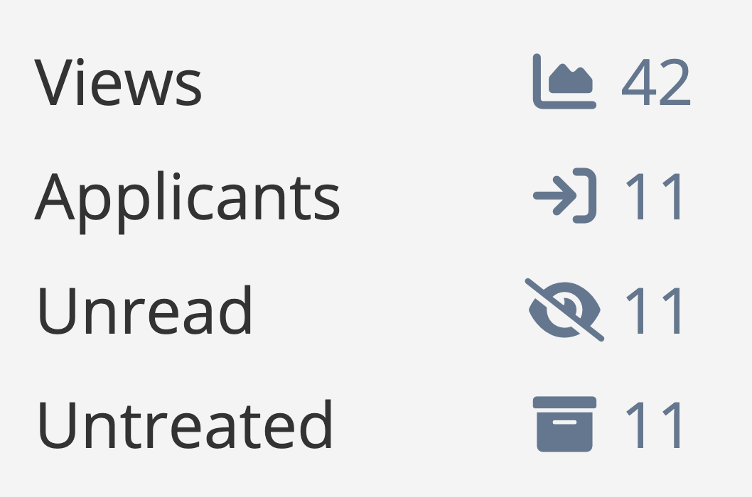 The column shows how many times your ad has been shown, how many applicants there are for the position, how many are untreated, and how many are in the process. In addition, you can see whether it has someone who has submitted applications since you last were in the application database.