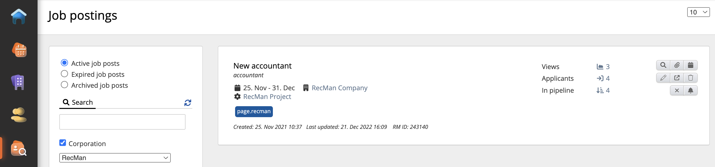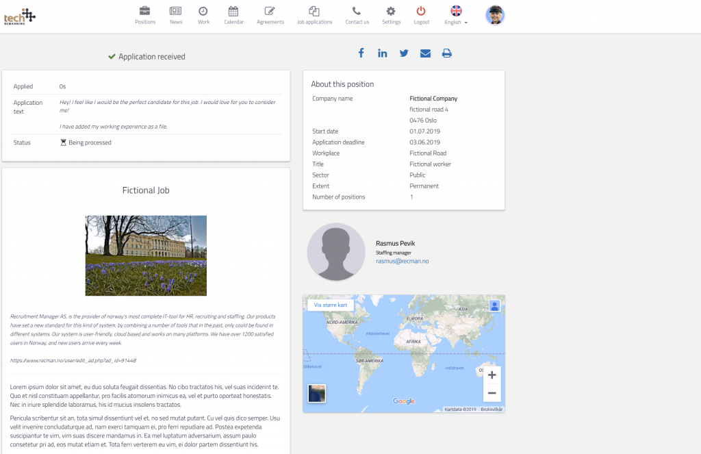 The picture above shows that the “New accountant” job post has been published on the RecMan-page. From the job post in the picture above, there is a lot of helpful information to extract. If you look to the right of the job post, you can see how many views, applicants, unread applications and untreated candidates you have connected to the job post. The job post will also be linked to relevant candidates already existing in the Candidate Database.