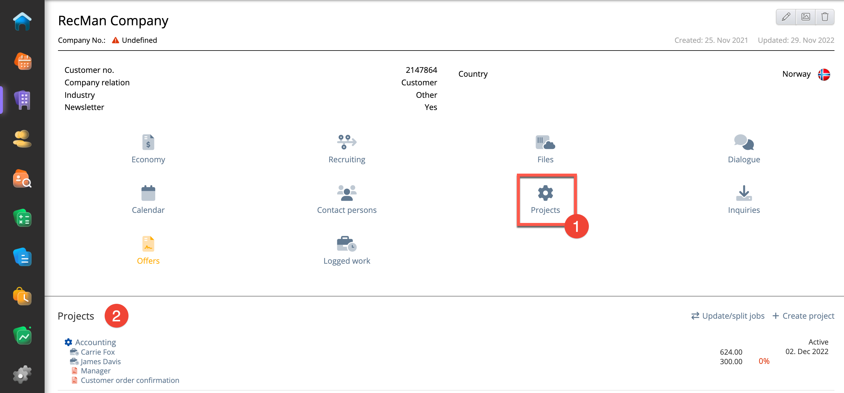 - Project card: From the previous step, we created this project card through the company card. You can also create new projects using the + button, and to access them, you can click the Projects icon in the navigation bar to get an overview of all the projects.