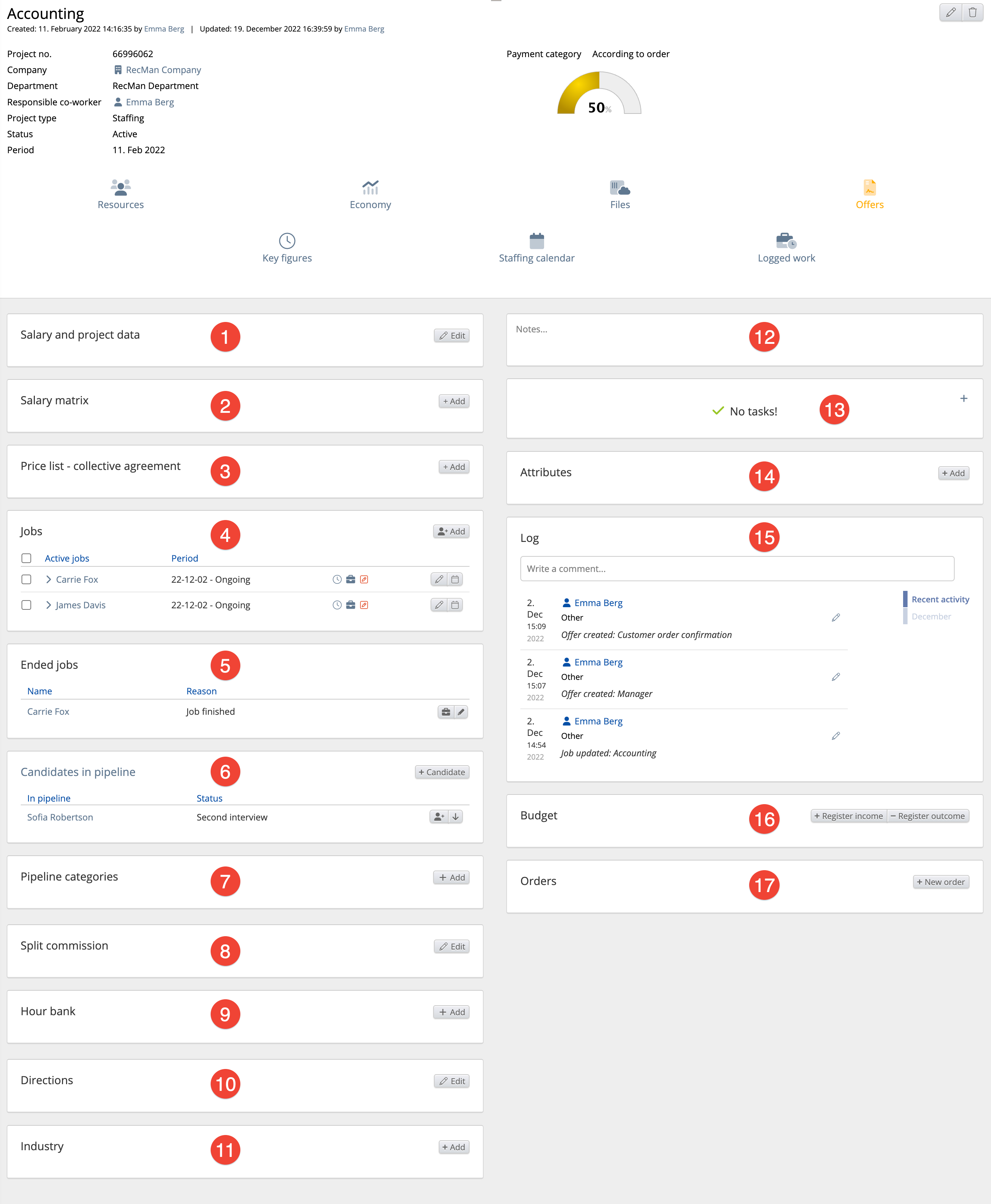 You can also add resources, look at the economy related to the project, upload files, and send out offers by clicking the buttons at the top of the project card (See picture above).