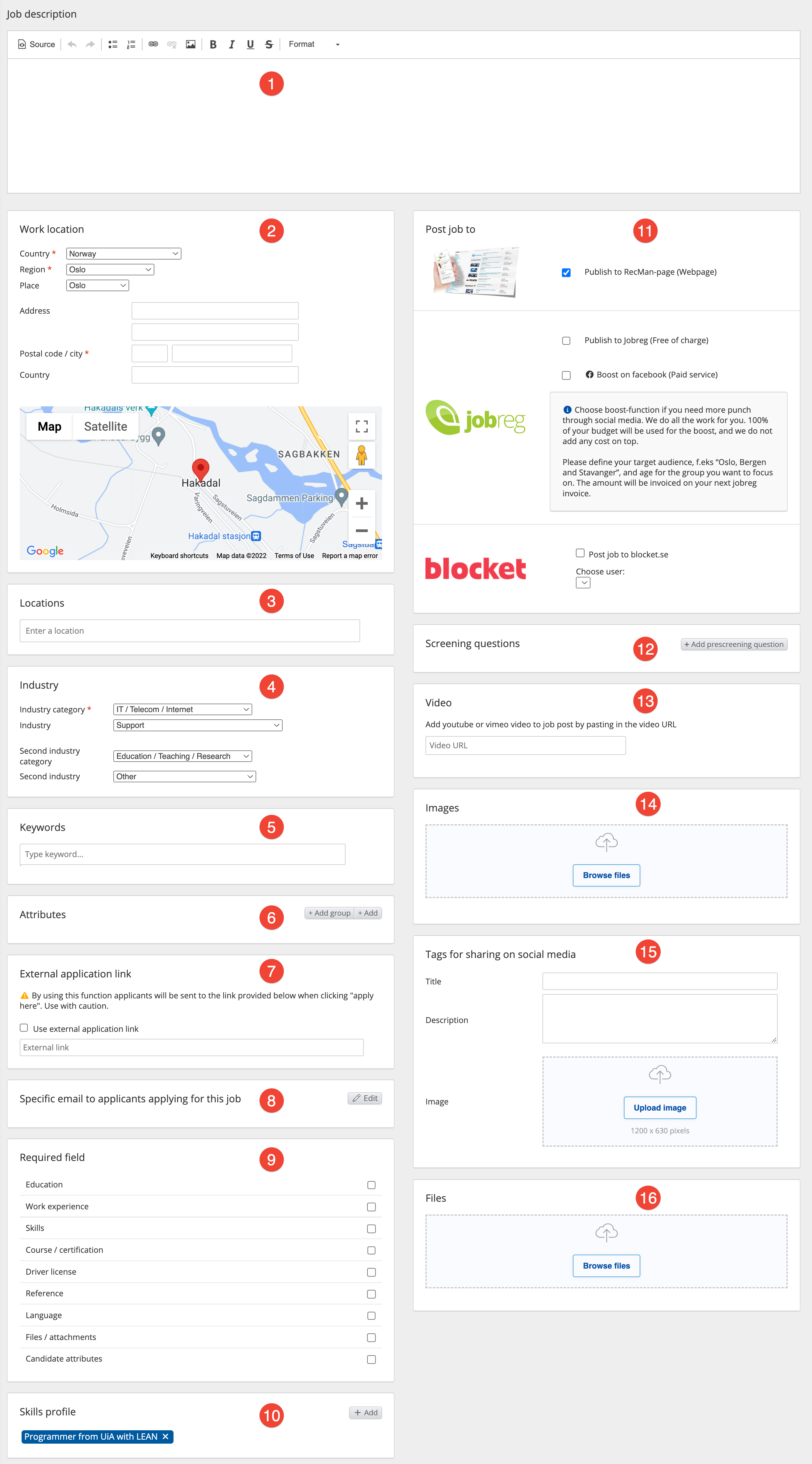 - Job description: This is where you enter the information that describes the job and what kind of candidate you wish to apply for the job.
