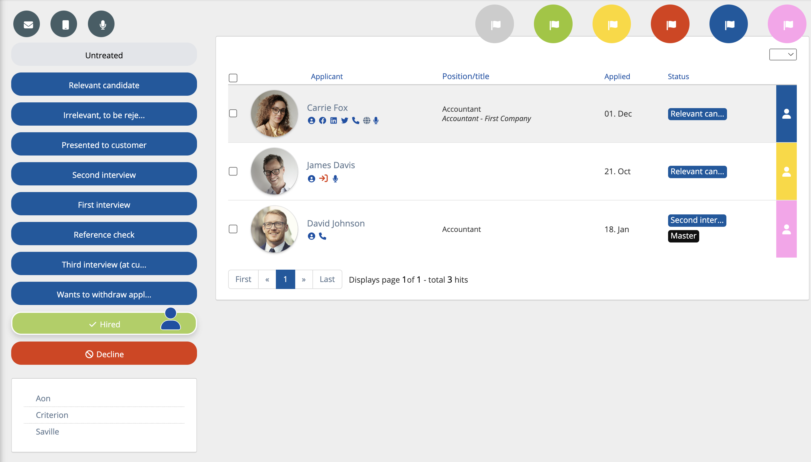 - This is how candidates who have applied will look like. It provides information about the candidate, it also gives you a way to contact the candidate (Look at the icons below the candidate’s name), and shows you the status the candidate is in concerning the job process.