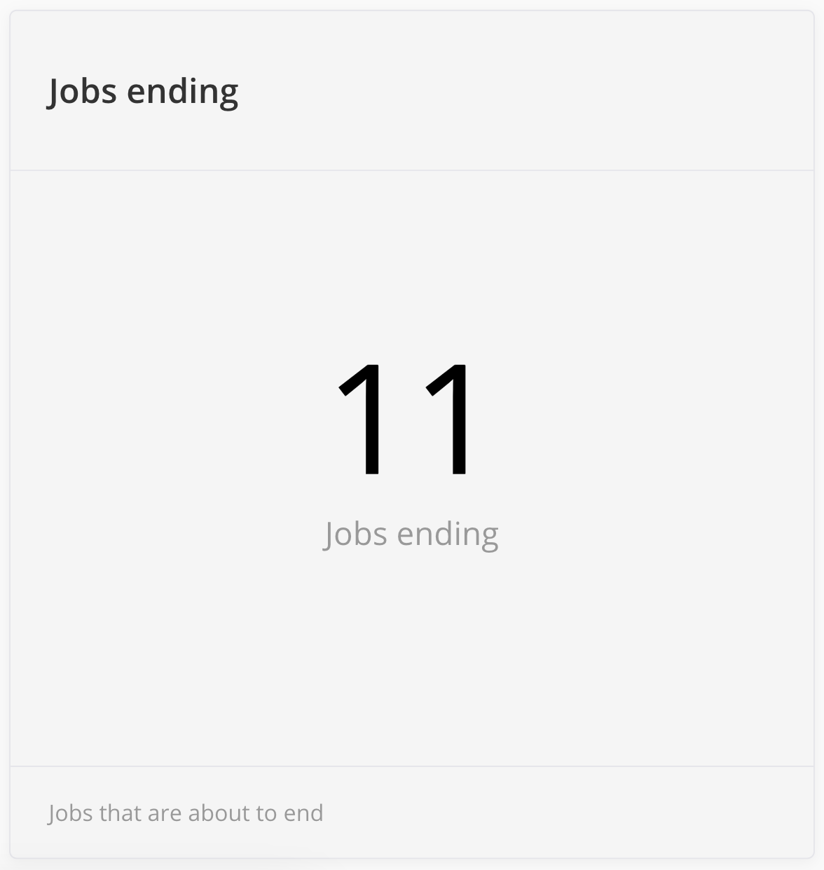 The Jobs ending widget counts jobs that are ending in a set period of time. While adding a candidate to the job on the project, the user can set the period of this job. In the widget settings, the user can set some period of time. For example, the period from Job1 is from 15-10-2023 to 31-10-2023, and the user chooses ‘Expires in’ 20 days. So, Job1 will be counted to the widget.