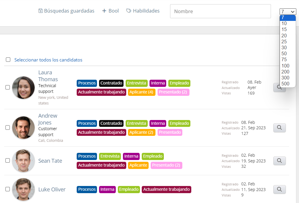 En todo el sistema, ya sea que esté en el CRM, la base de datos de candidatos, la base de proyectos o empleados, tendrá varias oportunidades para filtrar los resultados de su búsqueda.