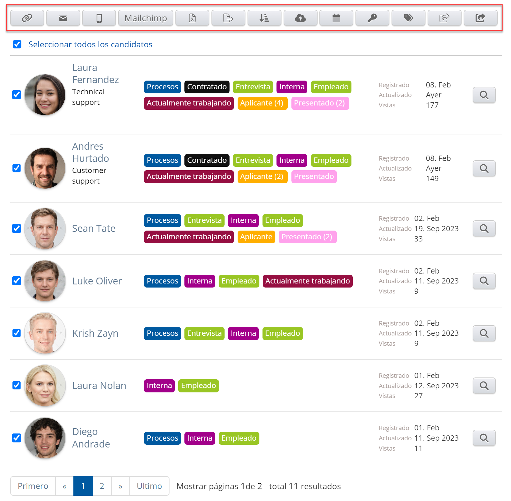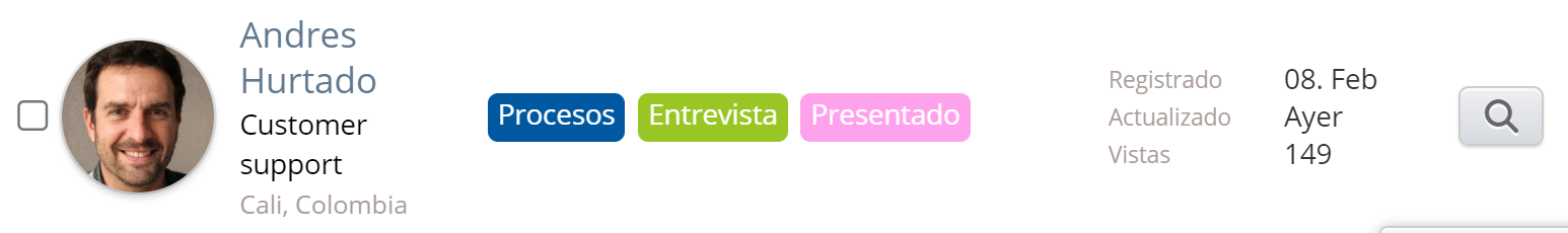 A menudo es deseable mostrar información importante de una lista sin tener que hacer clic necesariamente en una tarjeta de candidato/cliente en particular. Por ejemplo, en la base de datos de candidatos, queremos ver la lista de candidatos que han estado en una entrevista, en un proceso de candidatura o han solicitado uno o más puestos. Puede ver esta información en las etiquetas y puede hacer clic en la etiqueta, por ejemplo, una etiqueta de entrevista, para acceder al cuadro de entrevista en la tarjeta del candidato.