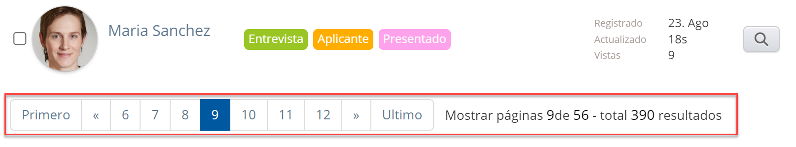 También verá el número de páginas en total y cuántos resultados se basan en sus criterios de búsqueda. En el caso siguiente, vemos que el sistema ha encontrado 390 resultados en la base de candidatos y que actualmente estamos en la página 9 de un total de 56 páginas.
