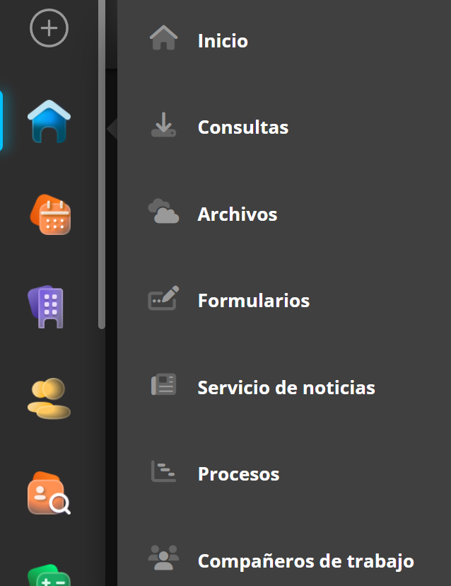 Pase el cursor sobre los iconos de la línea de navegación para ver los múltiples submódulos que contiene cada módulo.