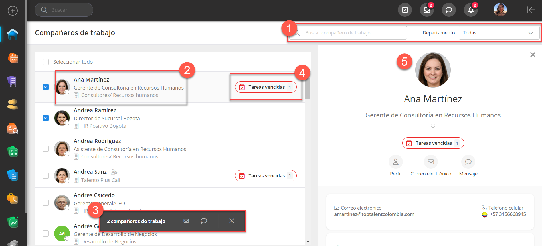 Al hacer clic en un compañero de trabajo, se abre un cajón (en el lado derecho) con más información y funciones para ver el perfil, enviar correos electrónicos y mensajes internos. También puedes seleccionar varios compañeros de trabajo, lo que habilita funciones para enviar correos electrónicos o mensajes a los compañeros seleccionados. Un punto verde junto a su foto de perfil indica su estado en línea, y en el lado derecho se mostrarán todas las tareas pendientes para cada compañero de trabajo.