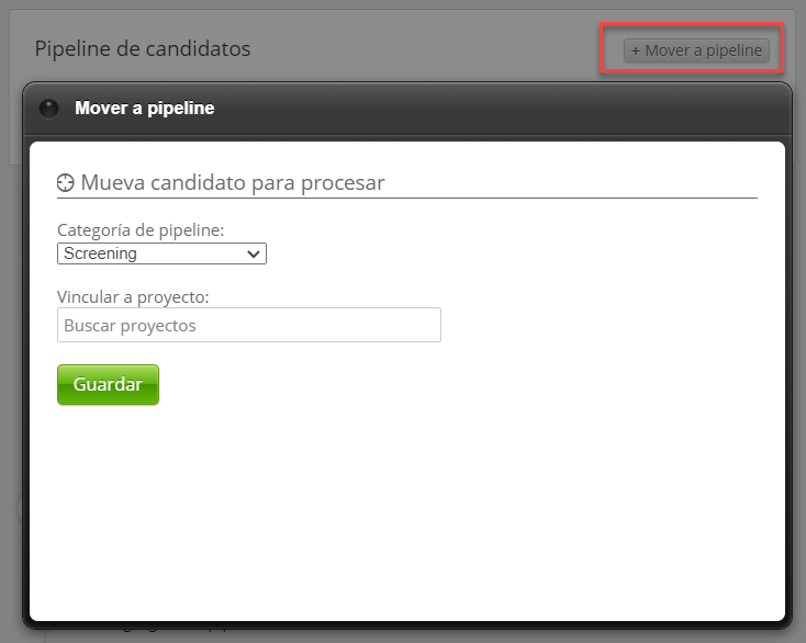 En la ilustración, vimos que cada proyecto tiene un pipeline de candidatos asociado. En este pipeline, agregamos candidatos manualmente, ya sea desde la base de candidatos o directamente desde una tarjeta de candidato.