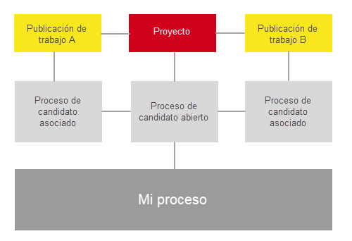 Central en RecMan es el proyecto. El proyecto se puede asociar con varias ofertas de trabajo. Cada publicación de trabajo tiene un pipeline de candidatos asociados.