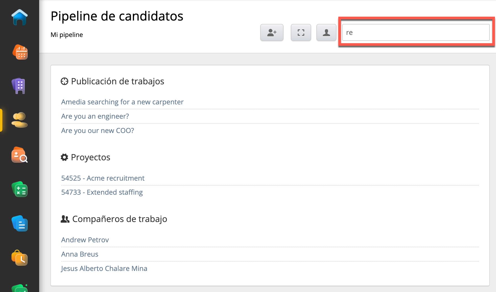 La forma más fácil de navegar entre los diferentes pipelines de candidatos es usar el campo de búsqueda dentro de la vista del pipeline de candidatos. Al buscar, el sistema sugerirá pipelines conectados a proyectos, ofertas de trabajo o pipelines de diferentes compañeros de trabajo (Mi pipeline).