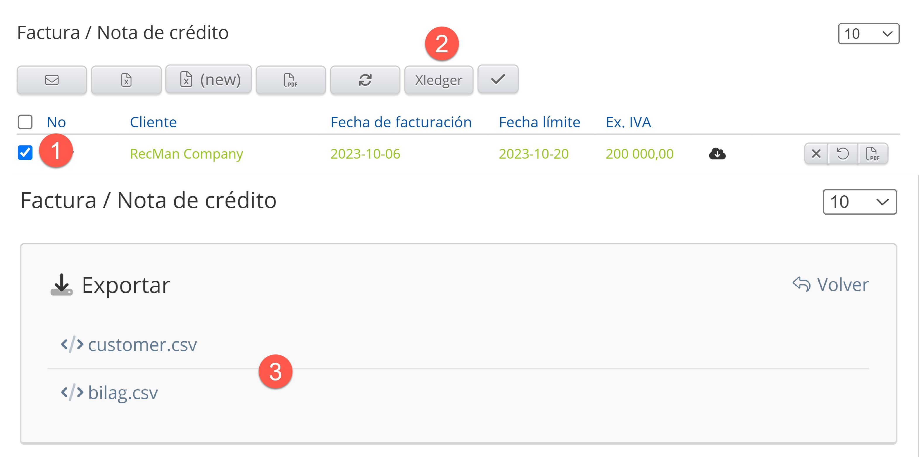 Al exportar a Xledger, puede ser bueno comprender qué campos de RecMan se incluyen en la exportación del archivo. Explicaremos esto con más detalle en esta parte del artículo. Lo primero que debe hacer es generar los archivos Xledger, esto se hace seleccionando las facturas correspondientes y haciendo clic en Xledger. Luego obtendrá dos archivos que puede descargar (que se muestran en la imagen a continuación) en formato CSV.