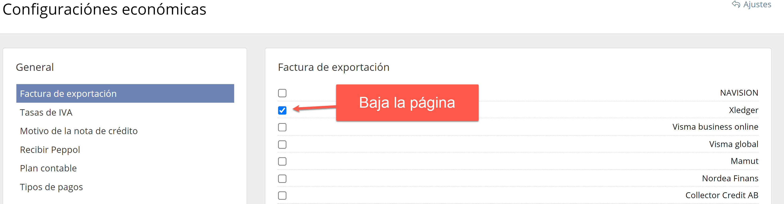 Vaya a Configuración del sistema → Economía → Factura de exportación y desplácese hacia abajo para encontrar y marcar Xledger como opción.