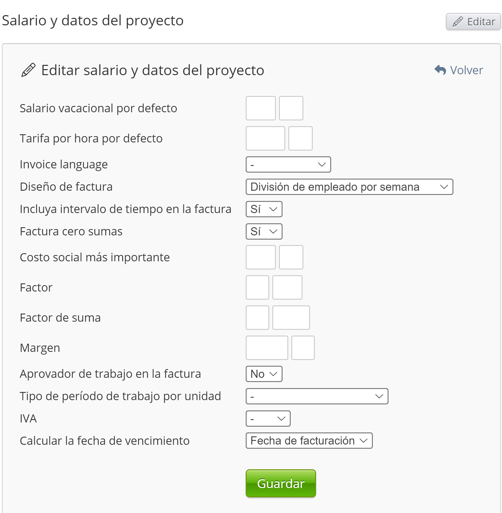 Puede, en cualquier momento, cambiar el diseño de una factura. Esto se hace fácilmente cambiando el diseño de la factura yendo a la ficha del cliente, luego yendo al cuadro de datos de salario y proyecto, y desde aquí, puede cambiarlo en el cuadro que se muestra en la imagen: