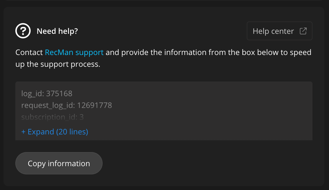 Si experimenta problemas donde lo anterior no ayuda, por favor envíe un correo electrónico a support@recman.io. En el correo también, proporcione el registro de integración de esta transferencia copiando la información del registro y pegándola en su correo.