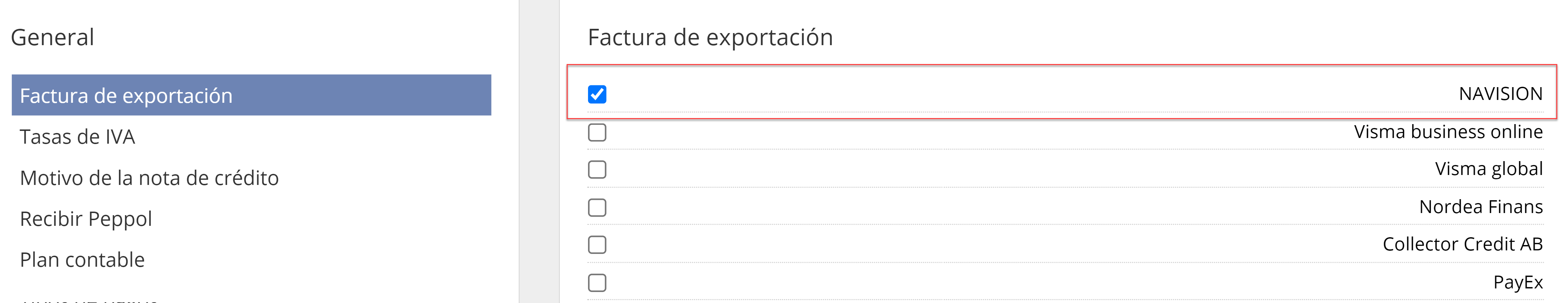 Vaya a Configuración del sistema → Economía → Factura de exportación y marque Navision como una opción para la exportación de facturas. Luego, Navision aparecerá como una opción en el resumen de facturas cuando haya marcado las facturas relevantes.