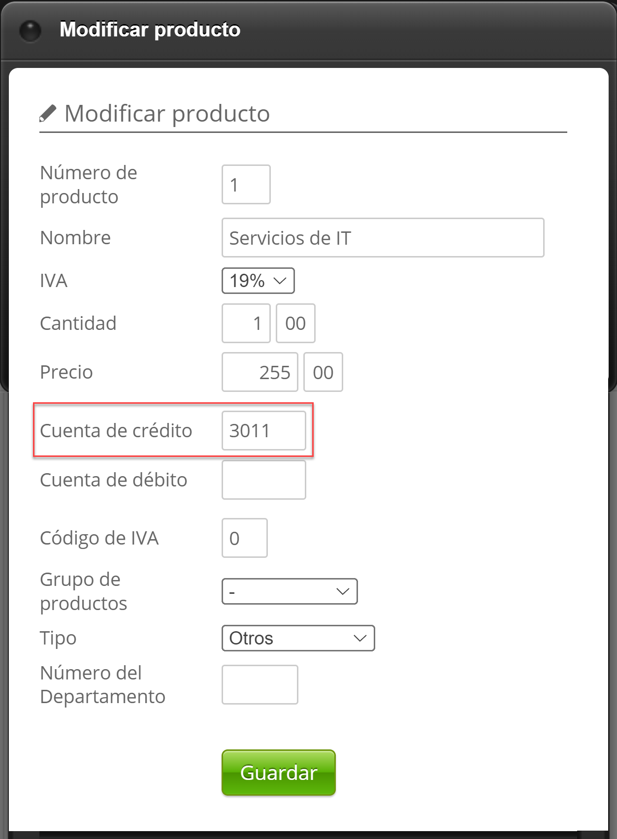 La imagen a continuación muestra dónde ingresa la cuenta de crédito (presione el botón Editar en la descripción general del producto). Como se ha dicho, estos deben corresponder con información similar que está registrada en Navision.