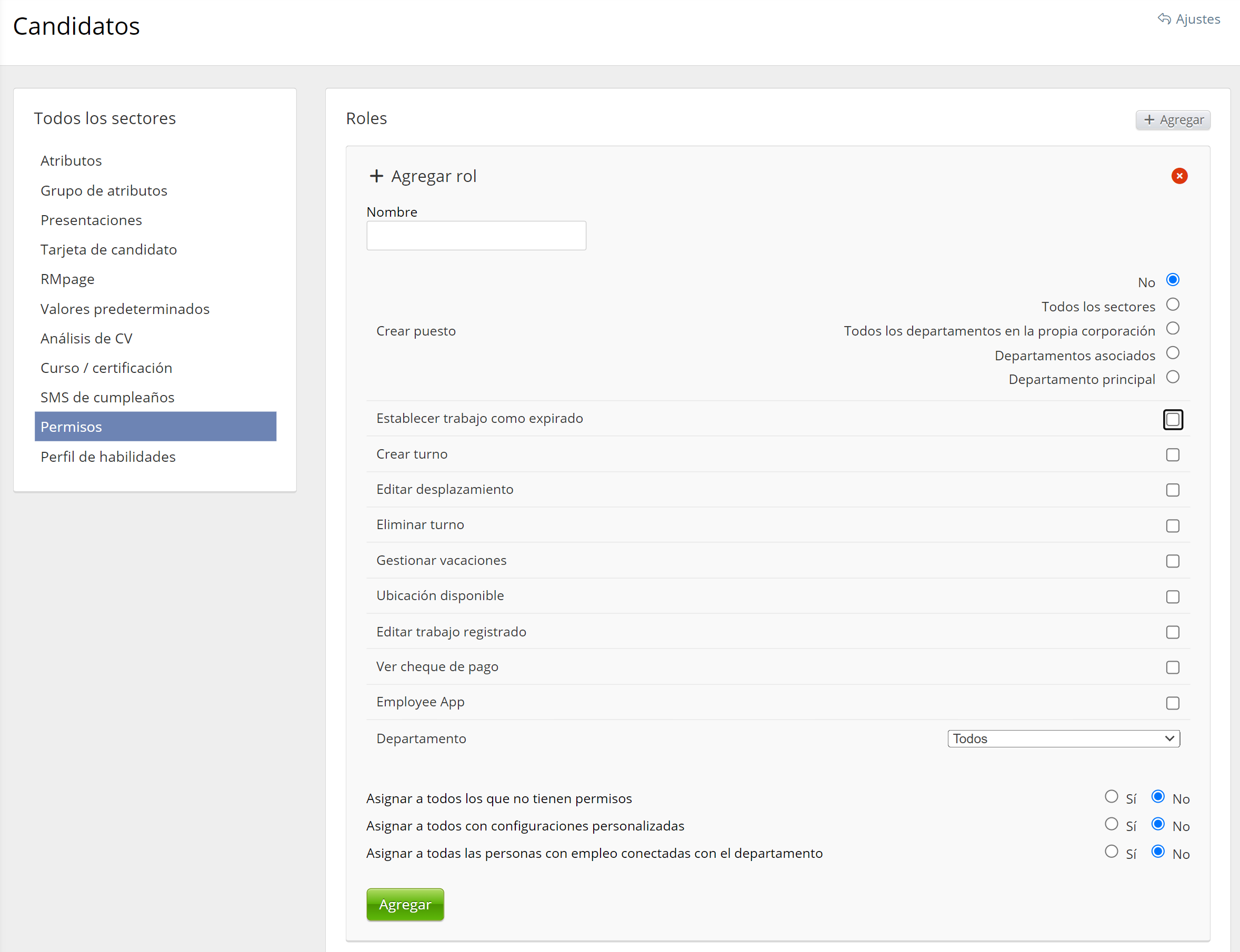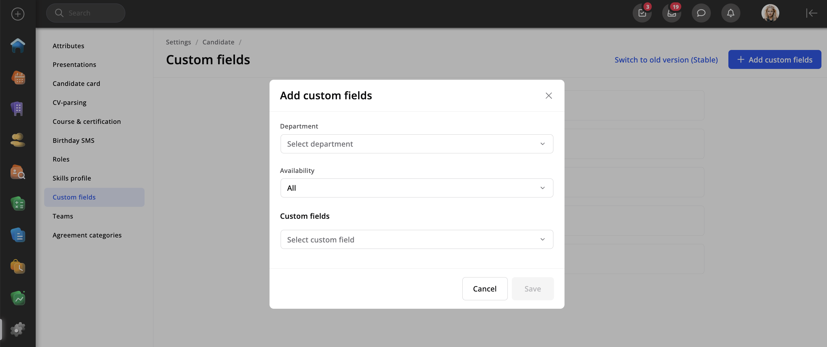 Aquí puede activar los campos personalizados para candidatos o empleados que se utilizarán en el módulo de reclutamiento o en el calendario de empleados. Tiene la opción de elegir un conjunto único de campos personalizados para cada departamento.