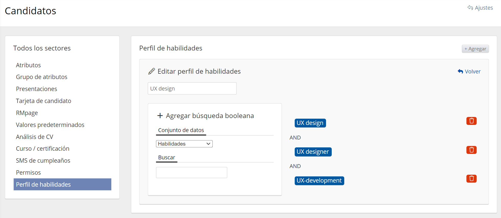 Brinda la posibilidad de crear conjuntos de habilidades y agregar palabras clave para cada uno de ellos.