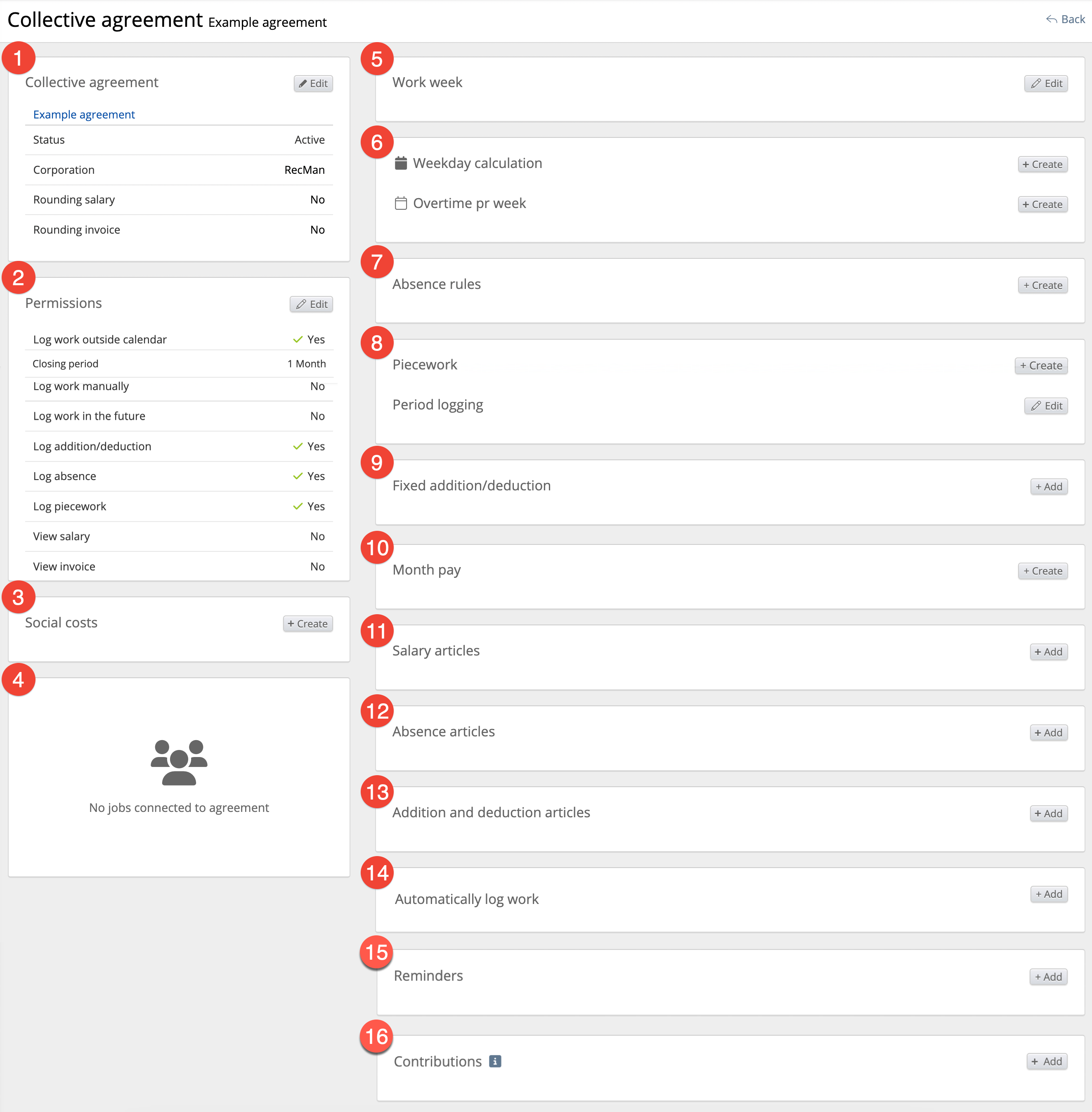 En la imagen de abajo, tenemos un acuerdo colectivo completamente nuevo y vacío que hemos llamado apropiadamente Acuerdo colectivo . Aquí, podrá ingresar una gran cantidad de información para hacer que los acuerdos estén listos para ser asignados a un trabajo, lo que le permitirá registrar el trabajo y crear nóminas y facturas desde el sistema. Debajo de la imagen, explicaremos los diversos cuadros numerados que se encuentran en la imagen.