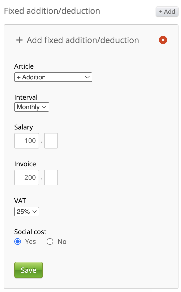 En este recuadro, tienes la oportunidad de ingresar una regla sobre artículos de adición y deducción. La adición/deducción fija es una regla que establece un precio sugerido fijo de Salario y Factura cuando tú o tu candidato han registrado trabajo en el intervalo establecido de un mes o una semana, y el artículo se agregará automáticamente cuando el trabajo registrado haya superado el intervalo establecido.