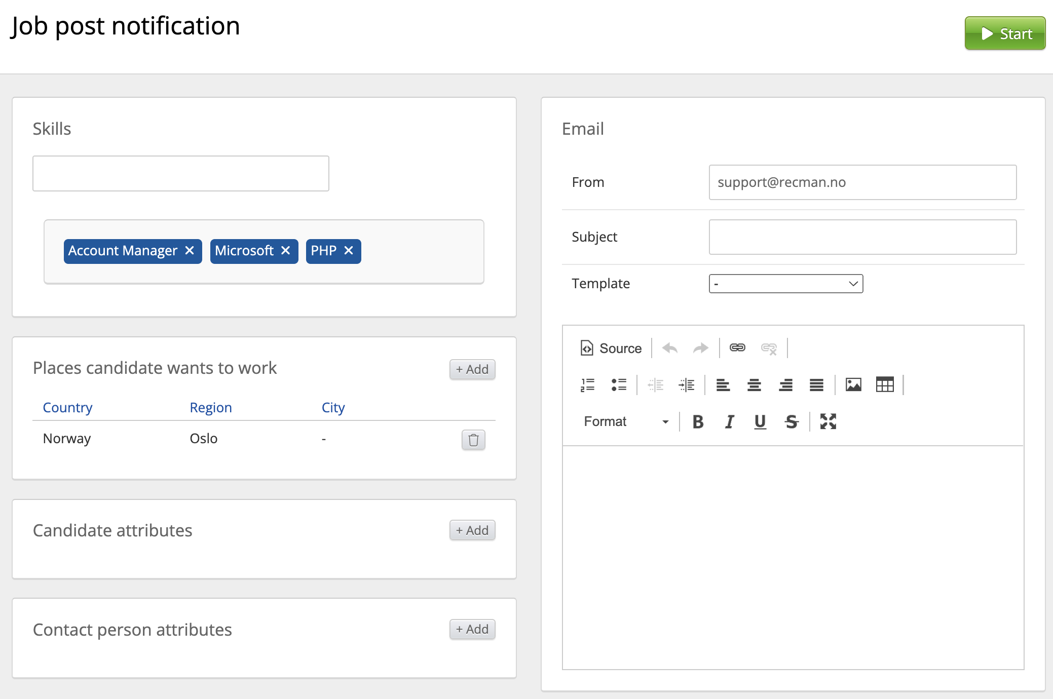En el lado izquierdo, puede configurar los criterios para determinar quién recibirá la notificación al activarla. Al agregar atributos de candidatos o incluir las ubicaciones donde los candidatos están disponibles para trabajar, se reduce la selección para ajustarla mejor a la oferta de empleo.