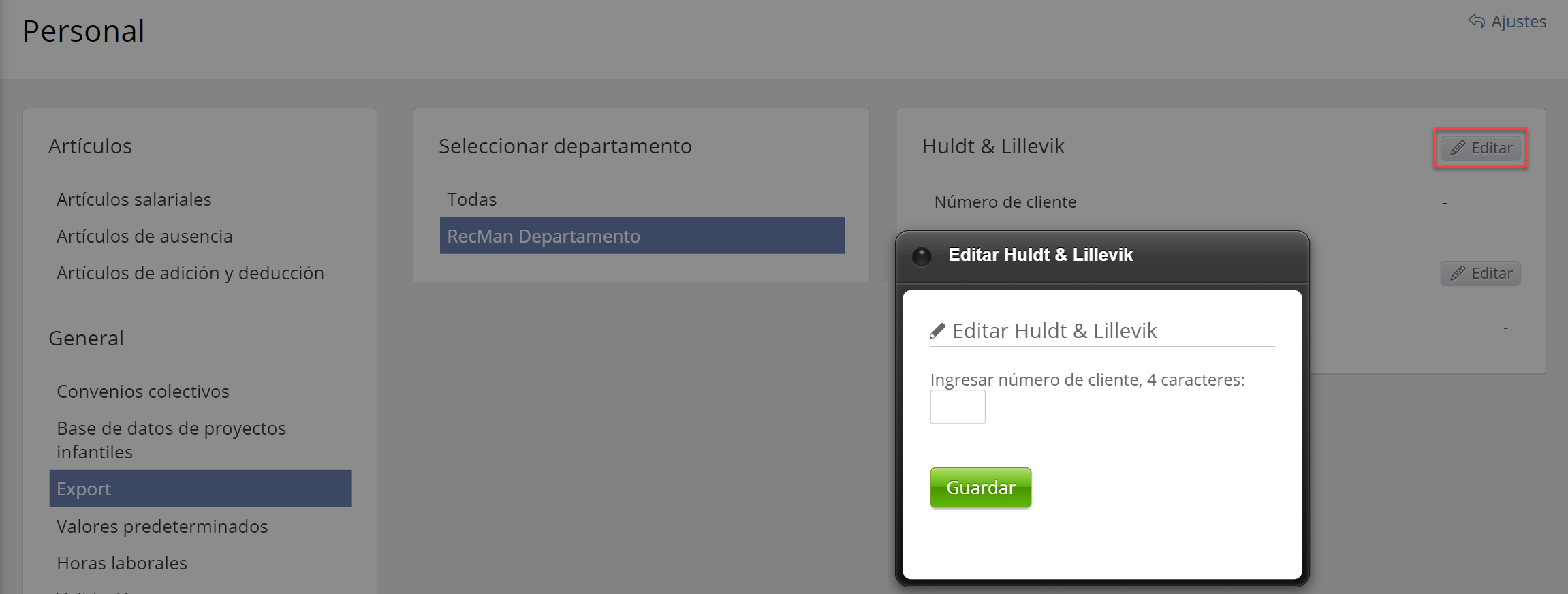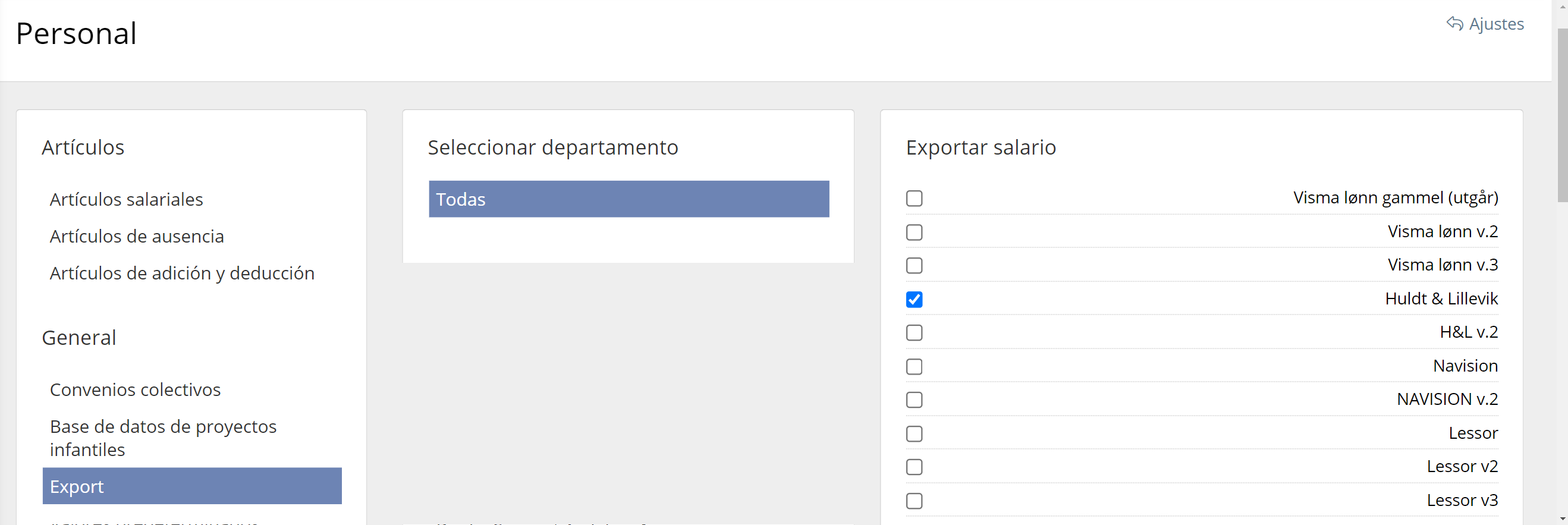 Vaya a Configuración del sistema → Personal → Exportar → Seleccionar departamento = Todos → marque Huldt & Lillevik (H&L). Entonces H&L surgirá como una alternativa al momento de exportar un cheque de pago en RecMan.