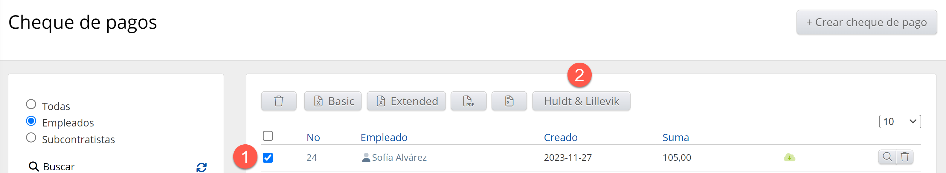 Luego vaya al resumen de los cheques de pago que se han creado en el sistema. Cuando marque uno o más cheques de pago, verá que H&L se presenta como una opción para exportar. Si hace clic en él, se descargará un archivo llamado huldt_og_lillevik_lonn.zip.