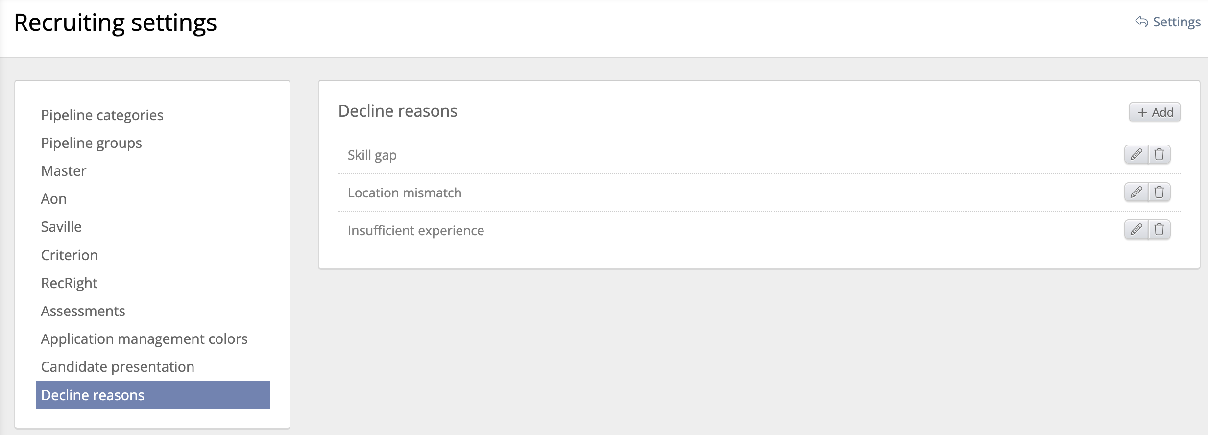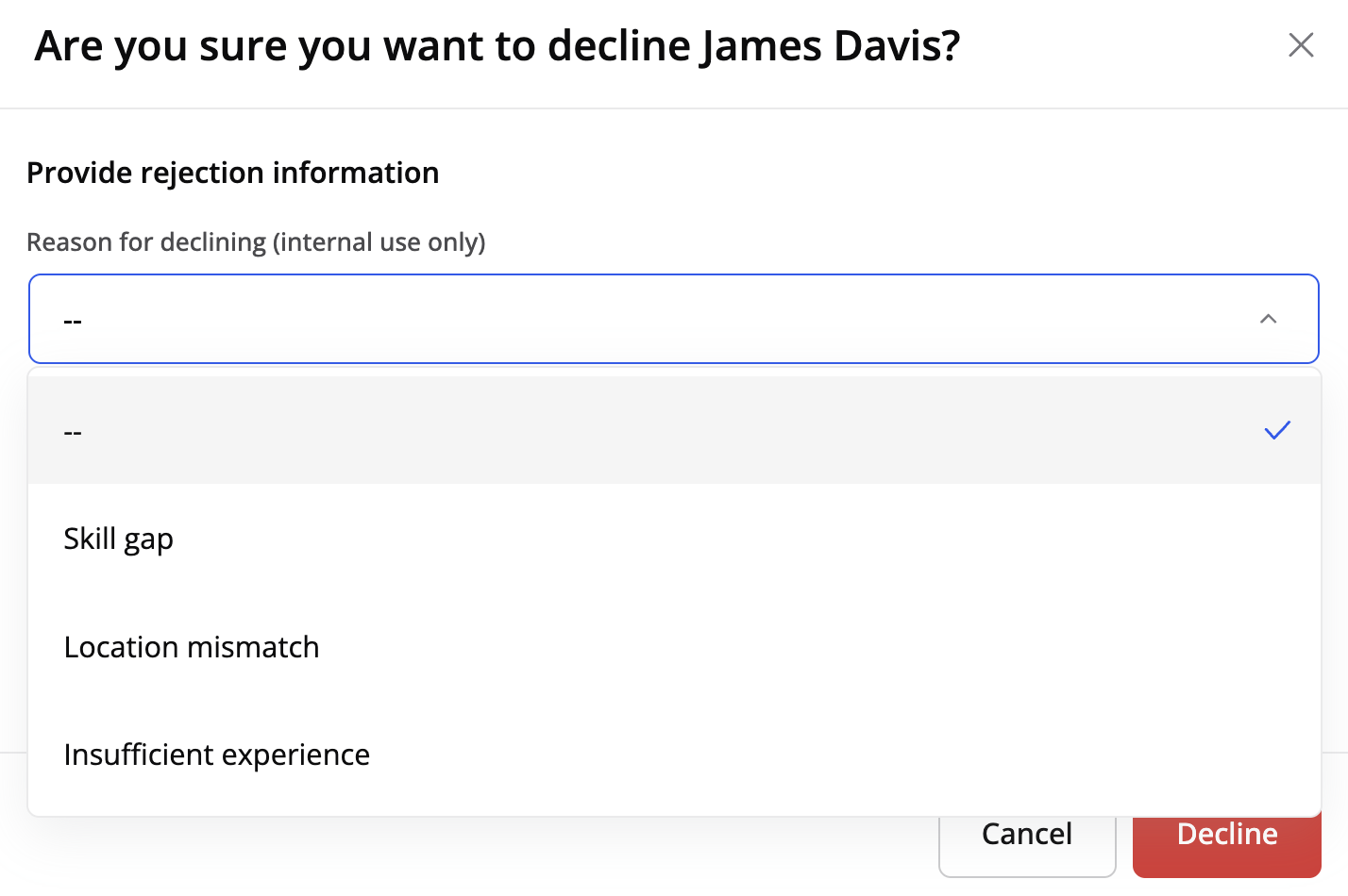 Aquí, puedes agregar razones de descarte a los solicitantes/candidatos que se utilizarán internamente (y no serán vistas por la persona rechazada). Además, la confirmación de rechazo debe estar habilitada en la configuración del proyecto de reclutamiento.
