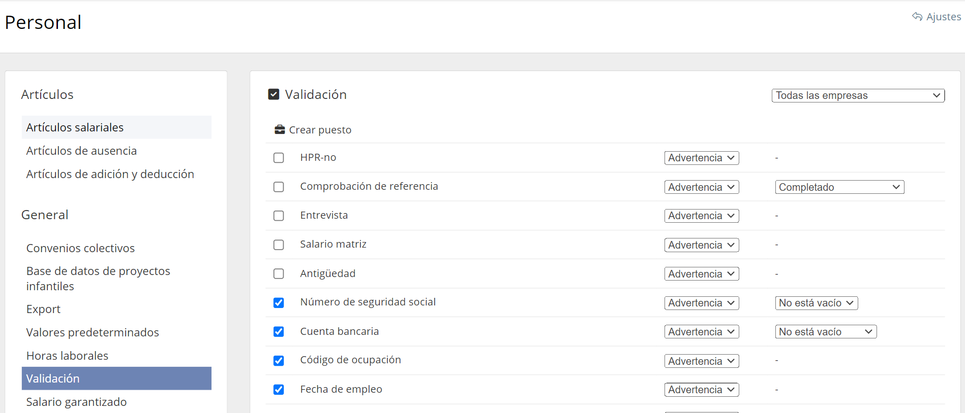 La validación la determina el administrador del sistema y afecta a toda la empresa. Tenga en cuenta que hacer cambios solo afectará las acciones futuras, no las anteriores.