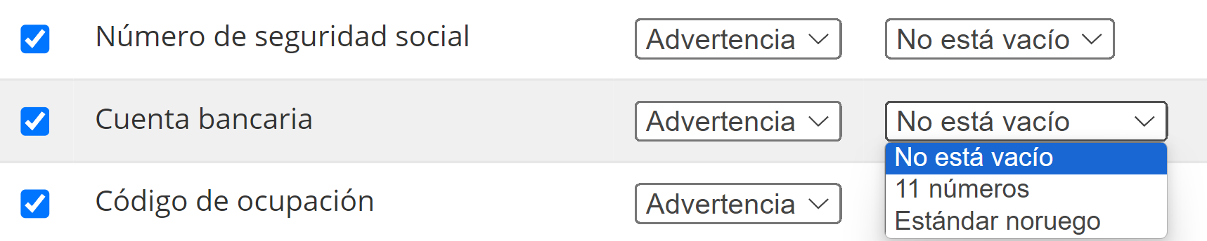 Como puede ver en la captura de pantalla anterior, algunos campos tienen un menú desplegable adicional. Esto significa que la validación no solo verifica si hay alguna información, sino que también verifica si está dentro de un estándar determinado. La verificación de referencia se puede configurar como Completada o Completada y aprobada. Estos son ajustes simples establecidos para una verificación de referencia. Sin embargo, la identificación del Seguro Social y la cuenta bancaria son más complicadas. La seguridad social y la cuenta bancaria tienen tres configuraciones: No vacío, 11 números y Norsk Standard. No vacío habla por sí mismo: debe haber información en el campo. 11 números requieren que el campo contenga 11 dígitos. Norwegian Standard realizará una verificación en la entrada del número para ver si el número es válido según Norwegian Standards. Esto significa que solo se puede ingresar en los campos una identificación de seguridad social noruega válida y real o una cuenta bancaria. Si la verificación del algoritmo falla, se mostrará el error o la advertencia.