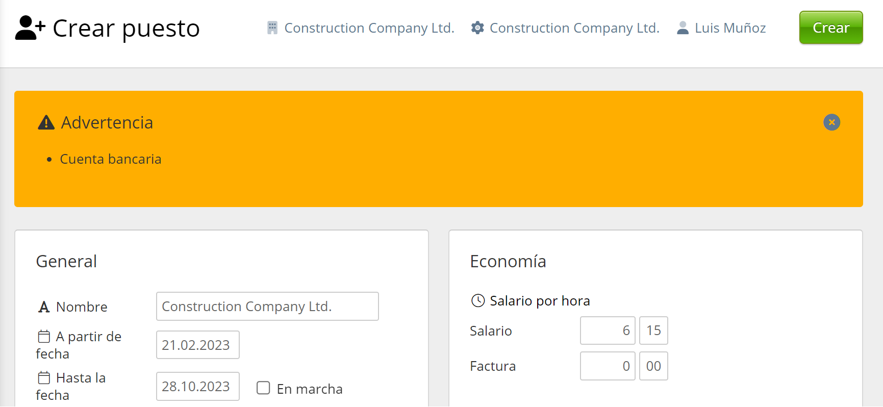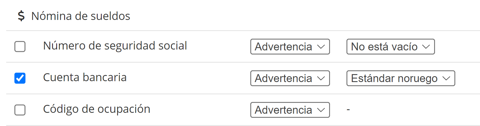 En la sección Nómina de la configuración de Validación, hemos activado una Advertencia para la cuenta bancaria. El mensaje de error se mostrará incluso antes de que se intente crear la Base Salarial. Para la advertencia, aparecerá un triángulo amarillo con un signo de exclamación cerca del empleado, y para el error, el rojo.