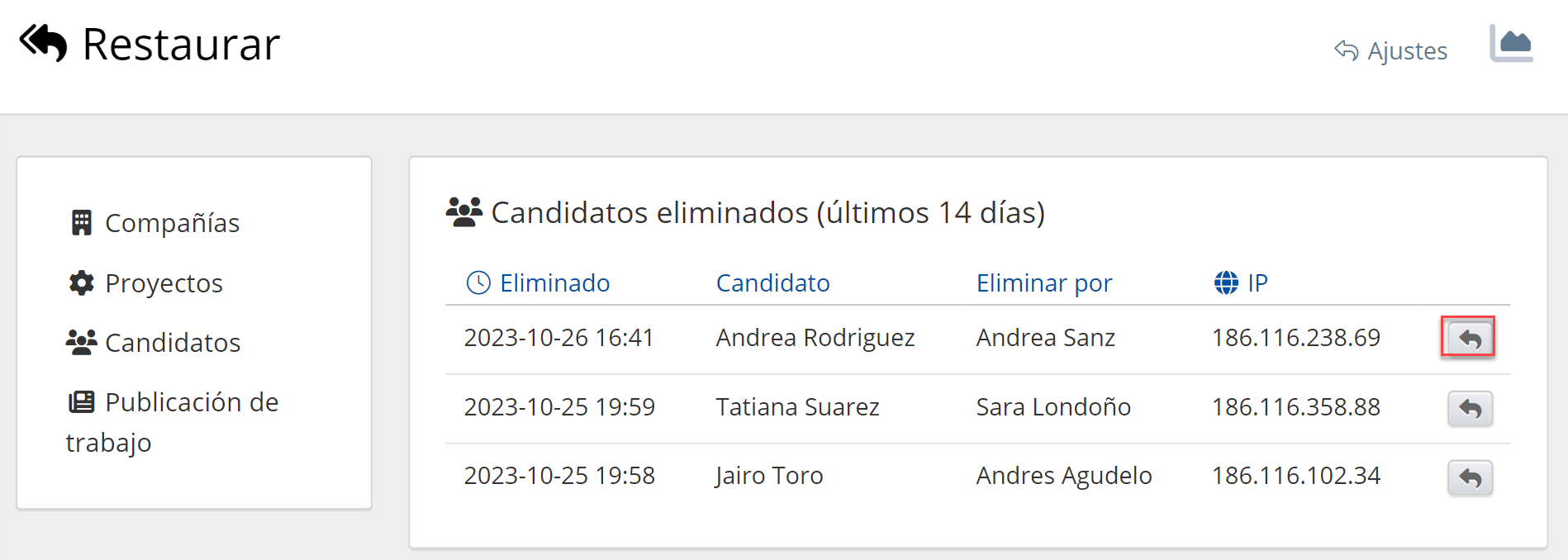 Aquí verá un pequeño menú de los diferentes elementos que puede restaurar. Como puede ver, puede restaurar empresas, proyectos, candidatos y anuncios de trabajo. Al hacer clic en el elemento que desea restaurar, puede ver qué elementos están disponibles para restaurar.