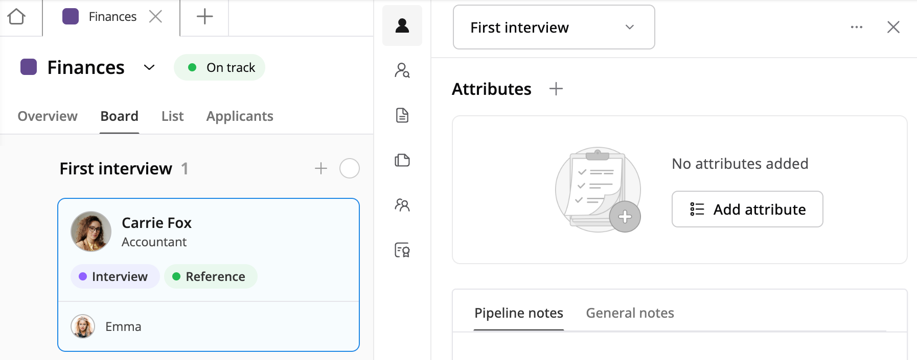 Cuando añade a un candidato y hace clic en su tarjeta, la primera pestaña que se abre es Resumen. Aquí, bajo Información general, puede añadir atributos.