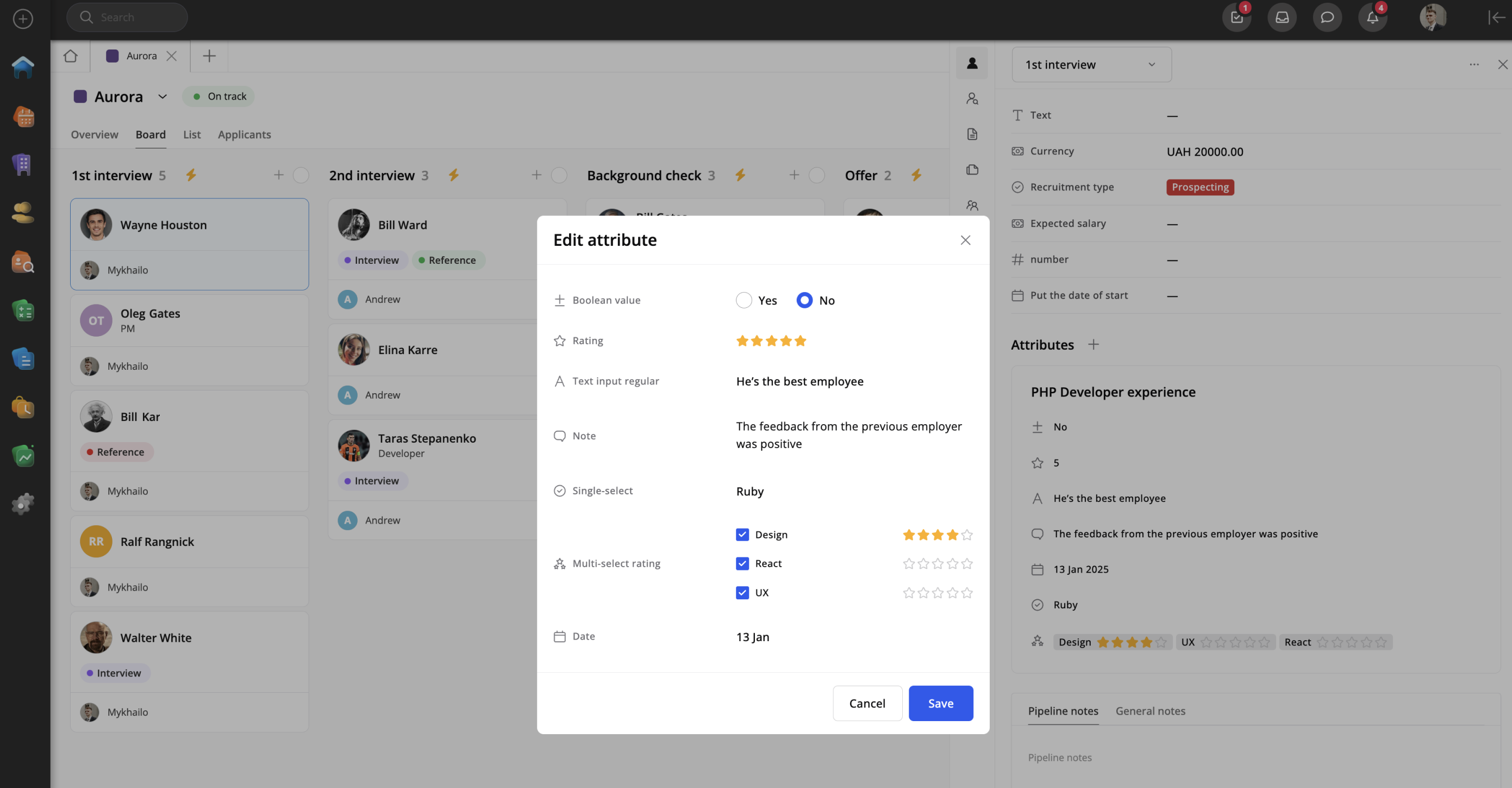 Los atributos de los candidatos son persistentes, lo que significa que permanecen con el candidato incluso a través de diferentes proyectos. Esto elimina la necesidad de volver a ingresar la información para el mismo candidato en futuros ciclos de reclutamiento.