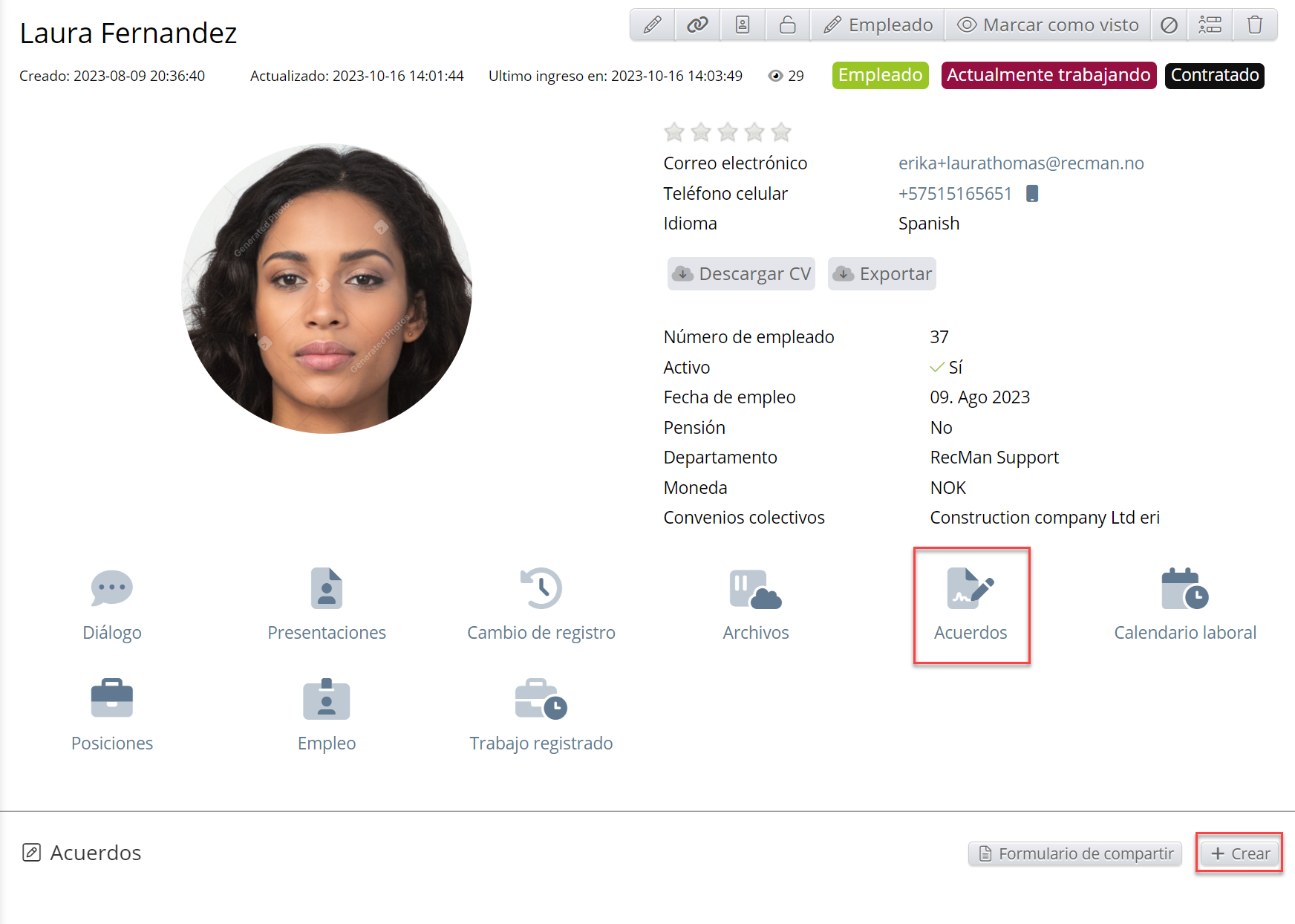 Al hacer clic en Acuerdos en la tarjeta del candidato, seguido de hacer clic en Crear, será dirigido a la página donde puede crear y enviar acuerdos (Mire la imagen de arriba).